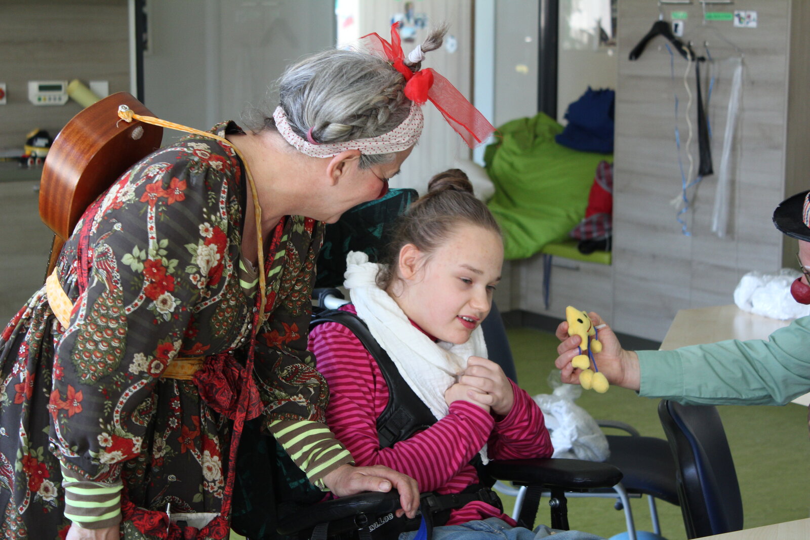 Dabei greifen sie die Impulse der jungen Bewohner:innen auf, um mit ihnen spielerisch in Kontakt zu treten. Rhythmische und melodiöse Improvisationen sind ein beliebtes Hilfsmittel. So reagieren viele Kinder mit Lachen, wenn Clown „Kurt“ beispielsweise in sein Cazoo den Namen des Kindes bläst oder lustige Lieder auf der Ukulele spielt.