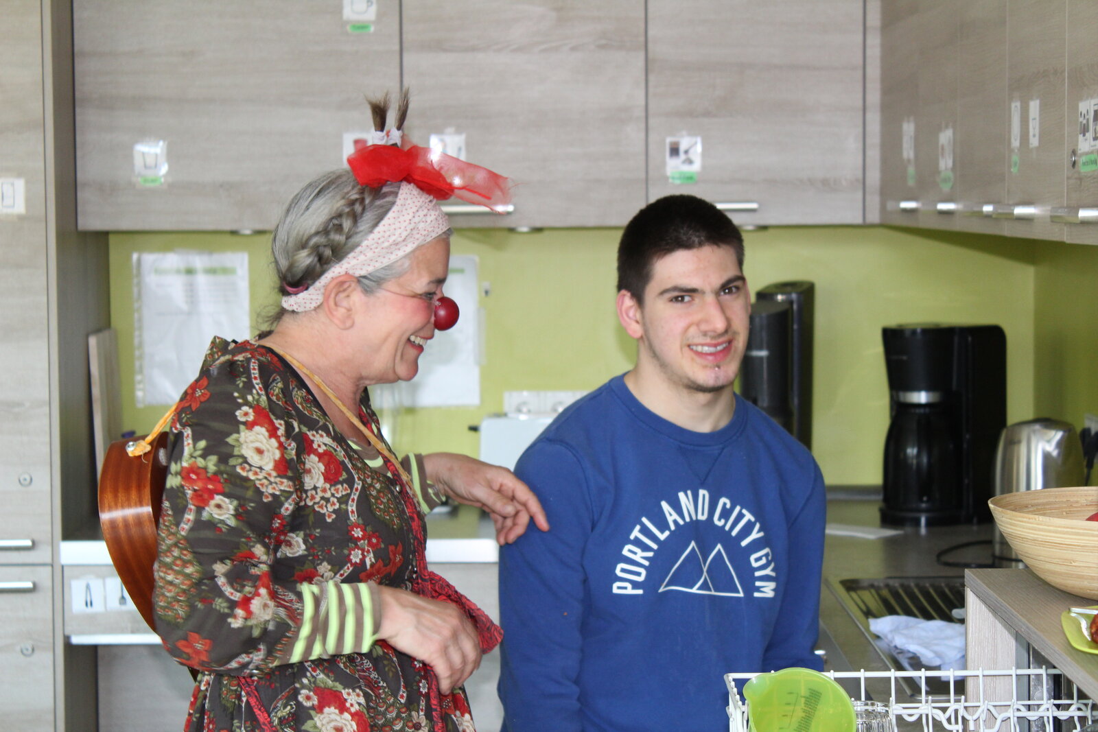 Die Besuche sind keine Vorführungen vor sitzendem Publikum, vielmehr fügen sich die Clowns in das Gruppengeschehen ein. So kommt es schon mal vor, dass Clownfrau „Violine Soundso“ beim Ausräumen der Spülmaschine „hilft“ – und dabei spielerisch für Chaos sorgt. Oder das Clown „Kurt“ zusammen mit Clownfrau „Wilma“ beim Dekorieren des Gemeinschaftsraumes für die nächste Geburtstagsparty unterstützt.