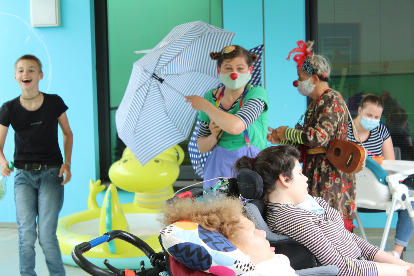Bei sehr lebhaften Bewohner:innen kommt es vor, dass die Clowns mit ihnen auch eher aktiv agieren und zum Beispiel im Sommer eine wilde Wasserschlacht mit Sprühflasche und Regeschirm im Innenhof veranstalten – sehr zur Freude der Kids und der Zuschauer:innen. Bei stärker beeinträchtigten oder eher ruhigeren Kindern hingegen nähern sich die Clowns auf eine besonnenere Art und singen ihnen zum Beispiel leise ein Lied vor.